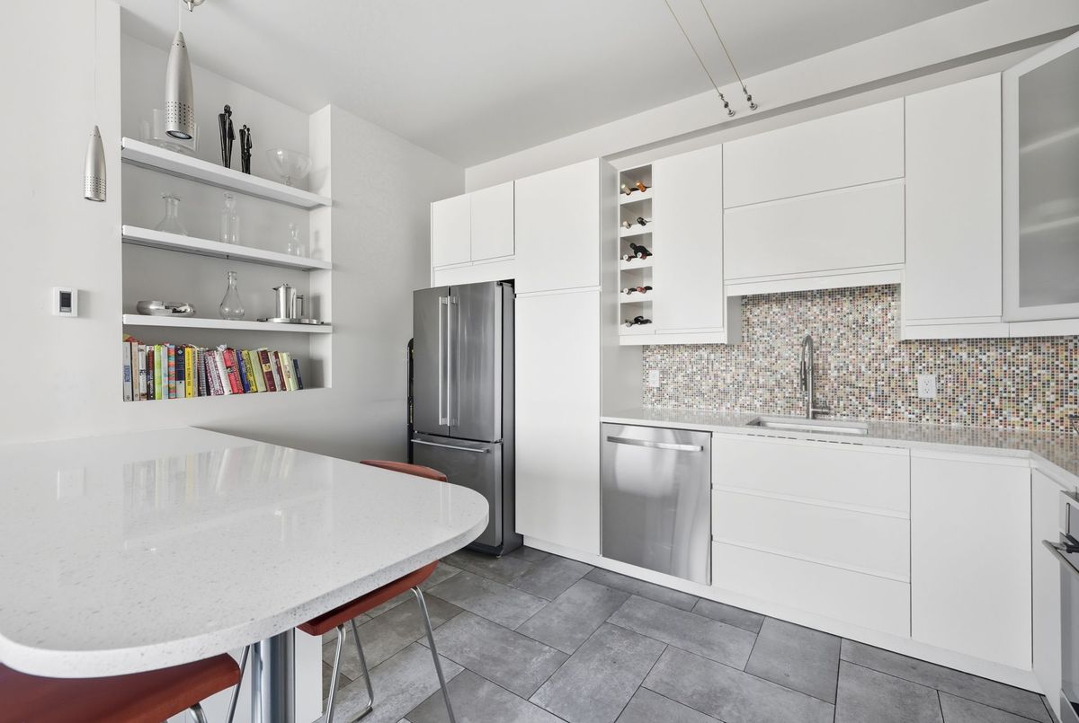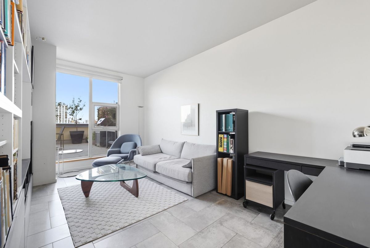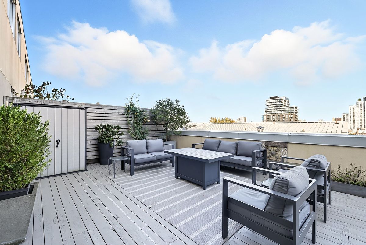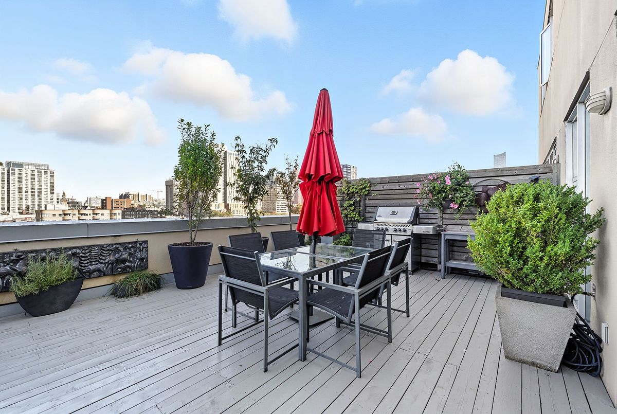 In the vibrant heart of Kensington Market, this rarely offered, sleek 2-bedroom, 2-bathroom Penthouse offers the perfect balance of energy and serenity, featuring a rare 622 sq. ft. terrace with peaceful north-facing views.Inside, floor-to-ceiling windows flood the open-concept living and dining area with natural light, while heated stone floors and lofty ceilings create a modern, seamless flow throughout. Enjoy the comfort and cost-savings of in-floor heating year-round, and take advantage of permitted BBQs on the incredible private terrace perfect for entertaining or unwinding in style.A spacious foyer with decorative slate flooring sets the tone for this thoughtfully designed urban retreat. The renovated kitchen transitions effortlessly from the living space and showcases a designer ceramic backsplash, stainless steel appliances, an eat-in breakfast counter, and ample cabinetry for stylish everyday living.Perfectly positioned on either side of the living area, the bedrooms ensure privacy and comfort. The primary suite easily accommodates a king-sized bed, with wall-to-wall closets, a walk-through dressing area, and a renovated spa-like 3-piece ensuite with in-suite laundry. The second bedroom, currently used as a family room and office, features custom built-in shelving, floor-to-ceiling windows, and access to a second elegant 3-piece bath.Residents enjoy access to a beautifully landscaped courtyard, a spacious party room, and secure underground parking with locker. With a Walk and Bike Score of 100, everything is at your doorstep from trendy cafes, restaurants, and boutiques to the University of Toronto, MaRS Discovery District, AGO, Trinity Bellwoods, and Queen West.
