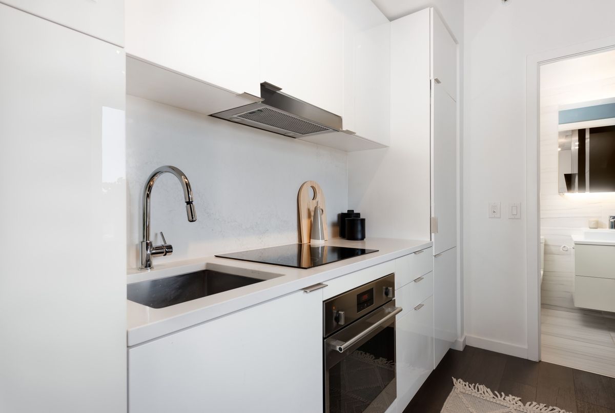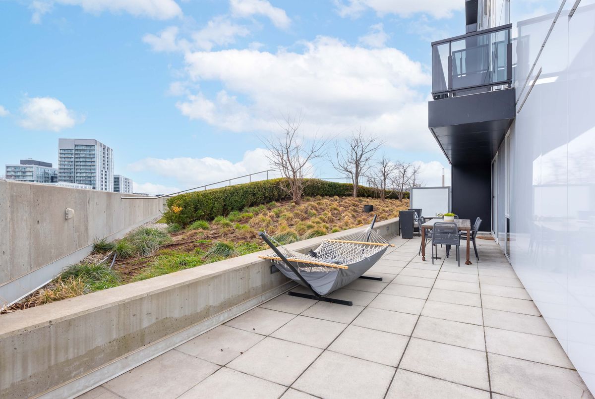 You can have it all - Low-maintenance condo living with your very own backyard in the sky. Welcome to Suite 711 at River City 3, a rare corner unit featuring an extraordinary 400 sq ft private terrace that truly redefines condo living. In a market full of cookie-cutter units, this home stands apart. Whether you're entertaining, creating an urban garden, or enjoying your morning coffee, this expansive outdoor space, complete with hardscaping and irrigated garden beds, offers a lifestyle typically reserved for luxury penthouses and rarely found in a one-bedroom suite. It's a seamless extension of your living space (and yes, your dog will love it too). Inside, the suite is equally impressive. Thoughtfully designed with no compromise, it features 9-ft exposed concrete ceilings, wide-plank hardwood floors, and floor-to-ceiling windows that fill the space with natural light, creating a bright, modern, loft-inspired feel. The sleek kitchen blends form and function with integrated appliances including a concealed Liebherr fridge, built-in oven and microwave, electric cooktop, and dishwasher. Caesarstone waterfall countertops and matching backsplash elevate the design, while custom cabinetry and a built-in breakfast provides exceptional storage and everyday comfort. The spacious bedroom accommodates a queen bed and offers ample closet space. The spa-inspired bathroom features a glass-enclosed shower with rain and handheld fixtures, modern tile, vanity with storage, and mirrored medicine cabinet. River City 3 is a LEED-certified, award-winning building with top-tier amenities including a fitness centre, yoga studio, party room, concierge, outdoor pool, lounge, kids playroom, and dog run. Located in the heart of Corktown, steps to parks, trails, Distillery District, St. Lawrence Market, and transit with easy access to downtown.