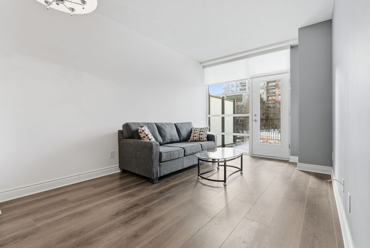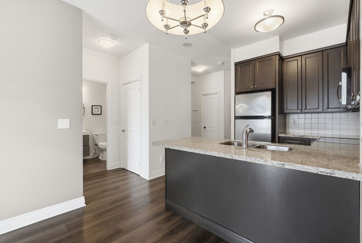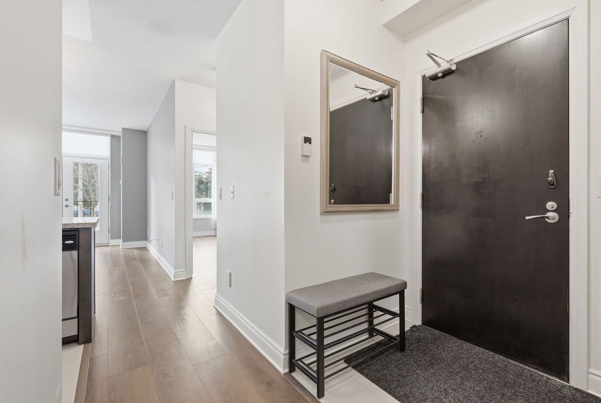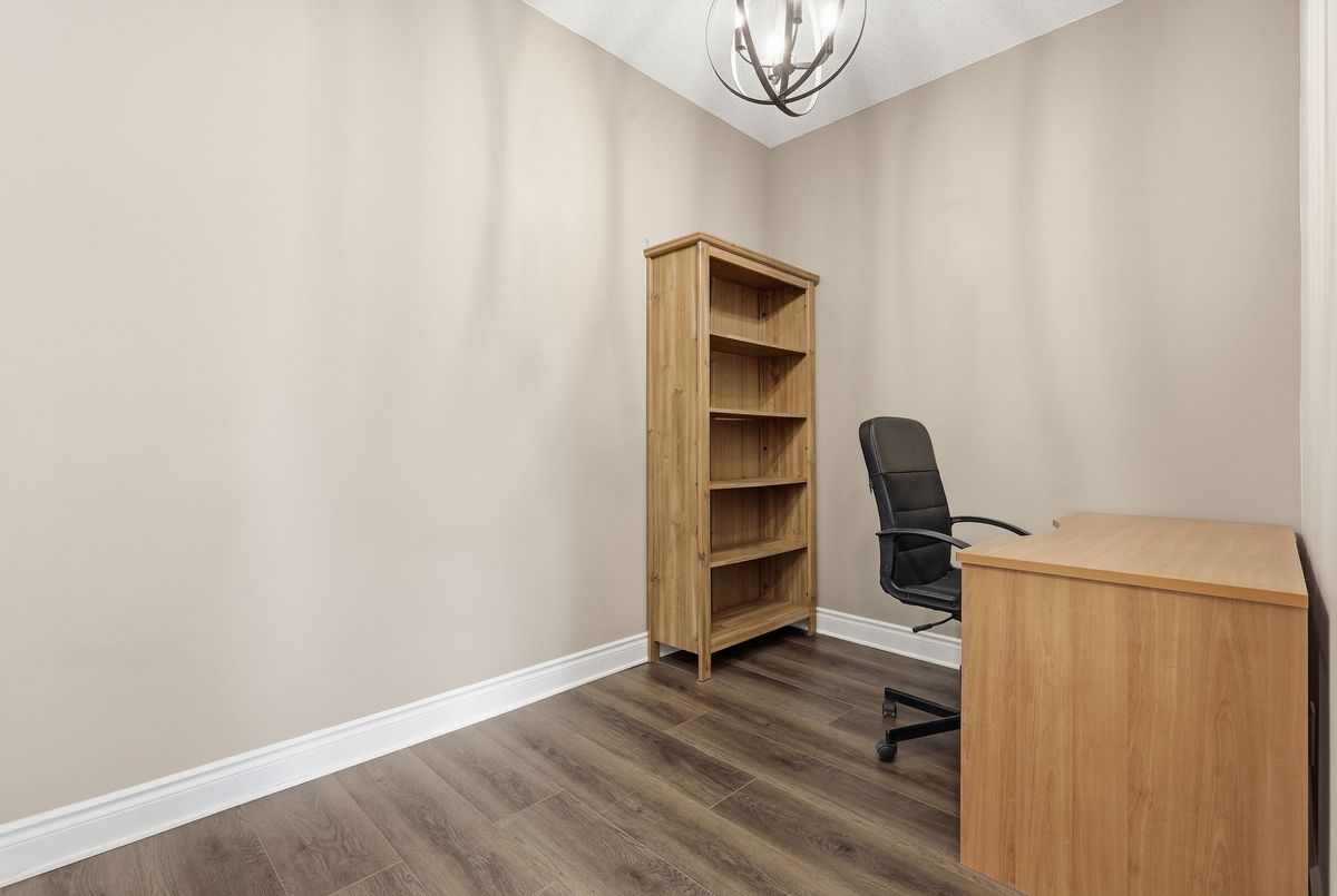 Sophisticated living awaits in this beautifully renovated suite located in a prestigious residence in the highly sought-after Beverly Glen community. Thoughtfully redesigned in 2021, this elegant unit blends modern finishes with a refined, comfortable atmosphere. The interior showcases 9-foot ceilings, sleek laminate flooring, custom blinds, and a bright open-concept layout that feels both spacious and inviting. The stylish kitchen is appointed with granite countertops, a tile backsplash, stainless steel appliances, and a breakfast bar-perfect for casual dining or entertaining. The living space extends to a charming, private terrace framed with greenery, offering a peaceful outdoor retreat and convenient gated access that can serve as a secondary entrance. A versatile den provides the perfect space for a private home office, reading lounge, or guest accommodation. The serene primary bedroom features a large sun-filled window and a double mirrored closet. The updated bathroom offers a contemporary aesthetic with a floating vanity and a sleek walk-in shower with striking black accents .A discreet in-suite laundry closet and additional storage complete this impeccably maintained home. Ideally situated just moments from Disera Shopping Village, Promenade Mall, parks, transit, and Highway 407, with an exceptional selection of dining and everyday amenities nearby. An outstanding opportunity to lease a refined and move-in-ready residence in one of the area's most desirable neighbourhoods.