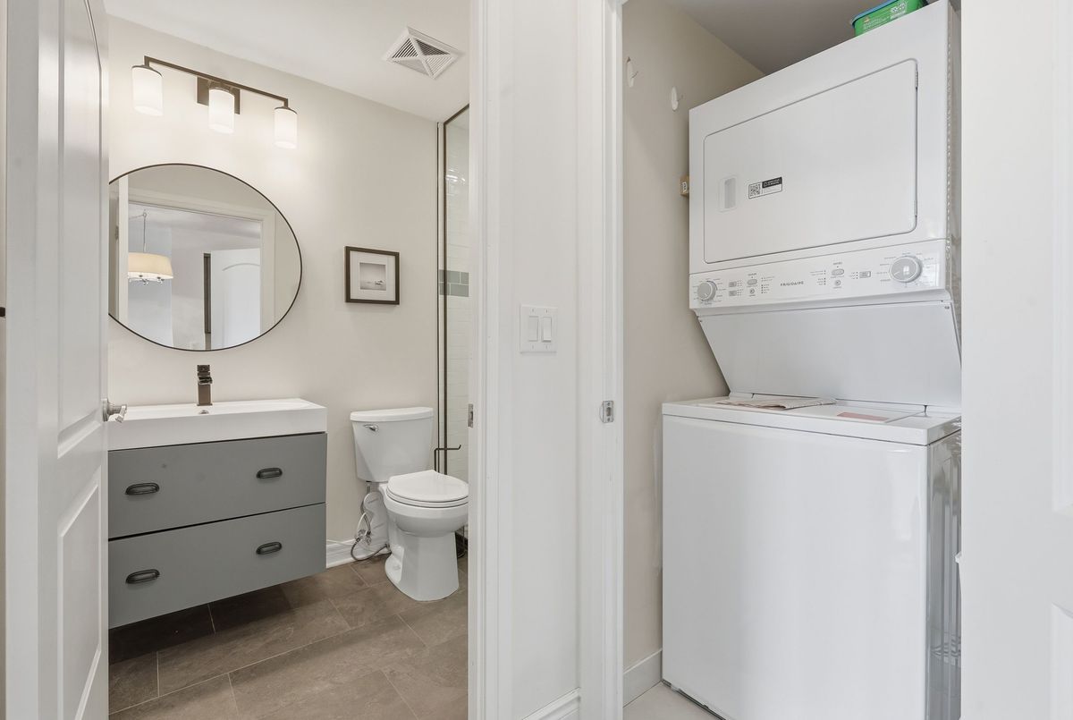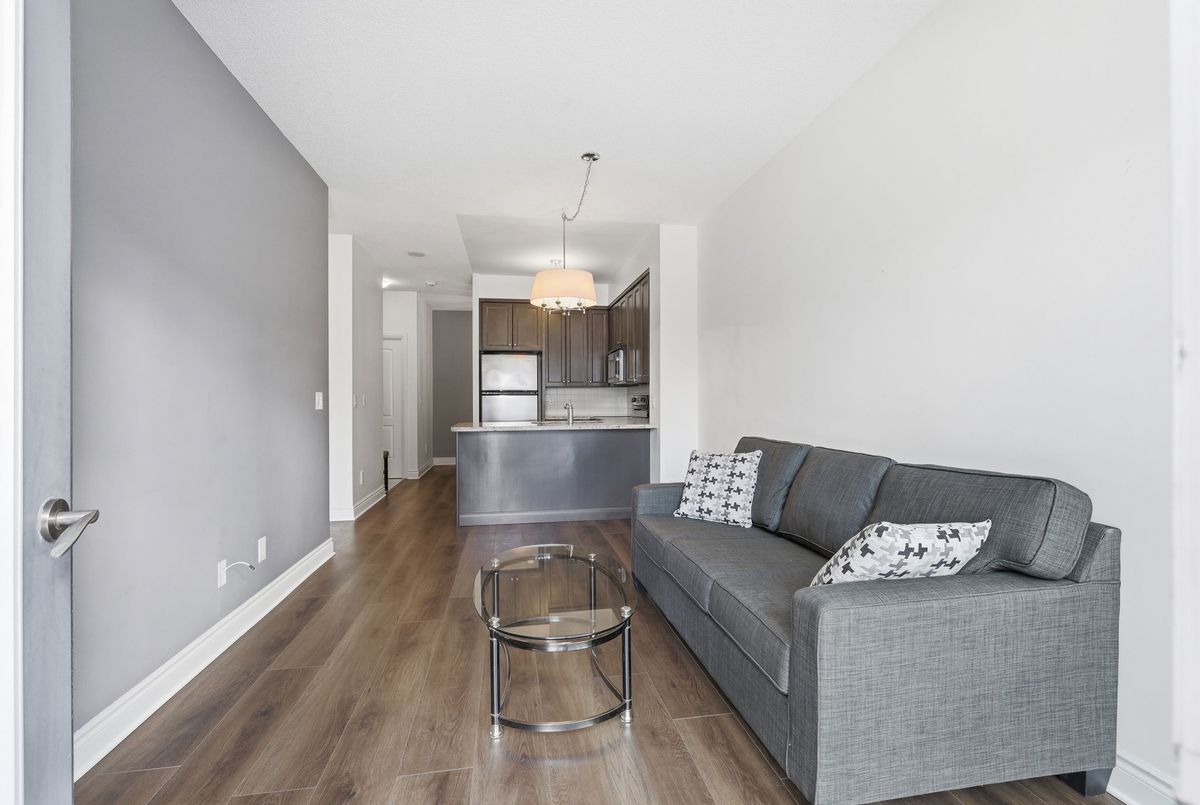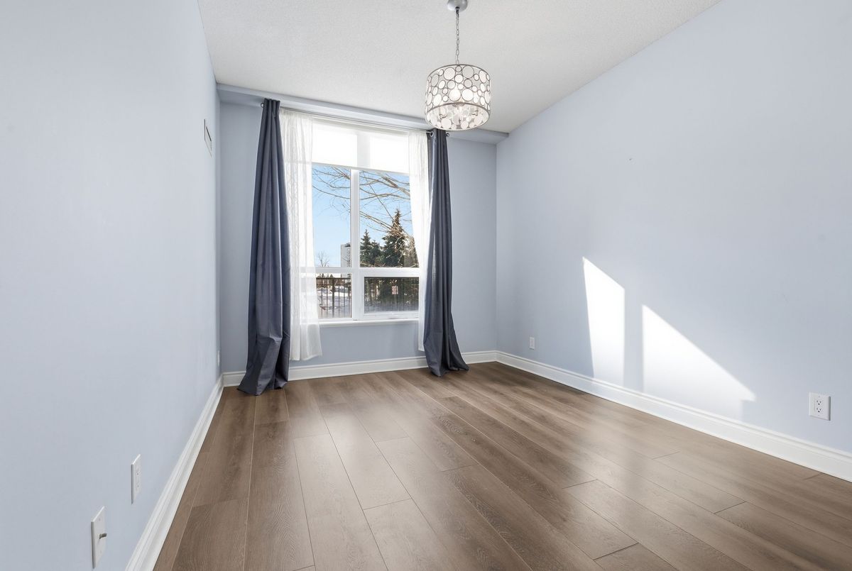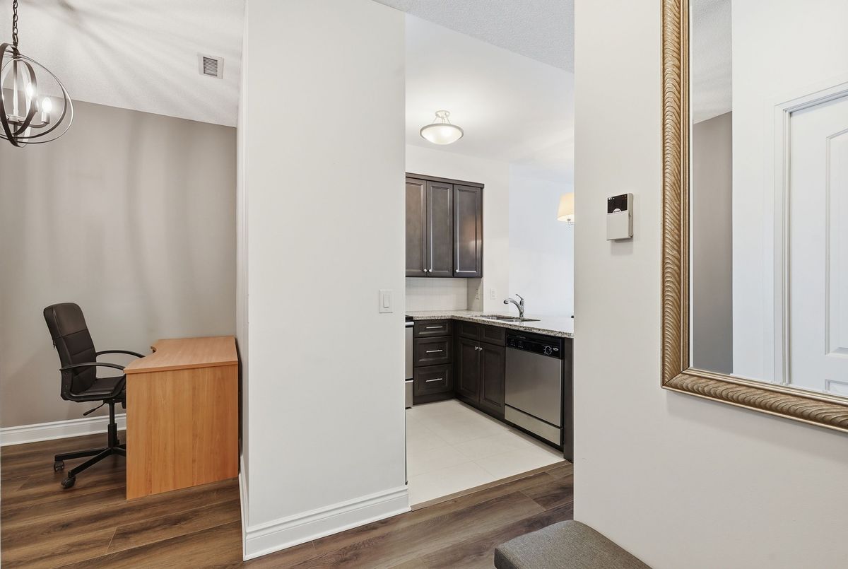 Sophisticated living awaits in this beautifully renovated suite located in a prestigious residence in the highly sought-after Beverly Glen community. Thoughtfully redesigned in 2021, this elegant unit blends modern finishes with a refined, comfortable atmosphere. The interior showcases 9-foot ceilings, sleek laminate flooring, custom blinds, and a bright open-concept layout that feels both spacious and inviting. The stylish kitchen is appointed with granite countertops, a tile backsplash, stainless steel appliances, and a breakfast bar-perfect for casual dining or entertaining. The living space extends to a charming, private terrace framed with greenery, offering a peaceful outdoor retreat and convenient gated access that can serve as a secondary entrance. A versatile den provides the perfect space for a private home office, reading lounge, or guest accommodation. The serene primary bedroom features a large sun-filled window and a double mirrored closet. The updated bathroom offers a contemporary aesthetic with a floating vanity and a sleek walk-in shower with striking black accents .A discreet in-suite laundry closet and additional storage complete this impeccably maintained home. Ideally situated just moments from Disera Shopping Village, Promenade Mall, parks, transit, and Highway 407, with an exceptional selection of dining and everyday amenities nearby. An outstanding opportunity to lease a refined and move-in-ready residence in one of the area's most desirable neighbourhoods.