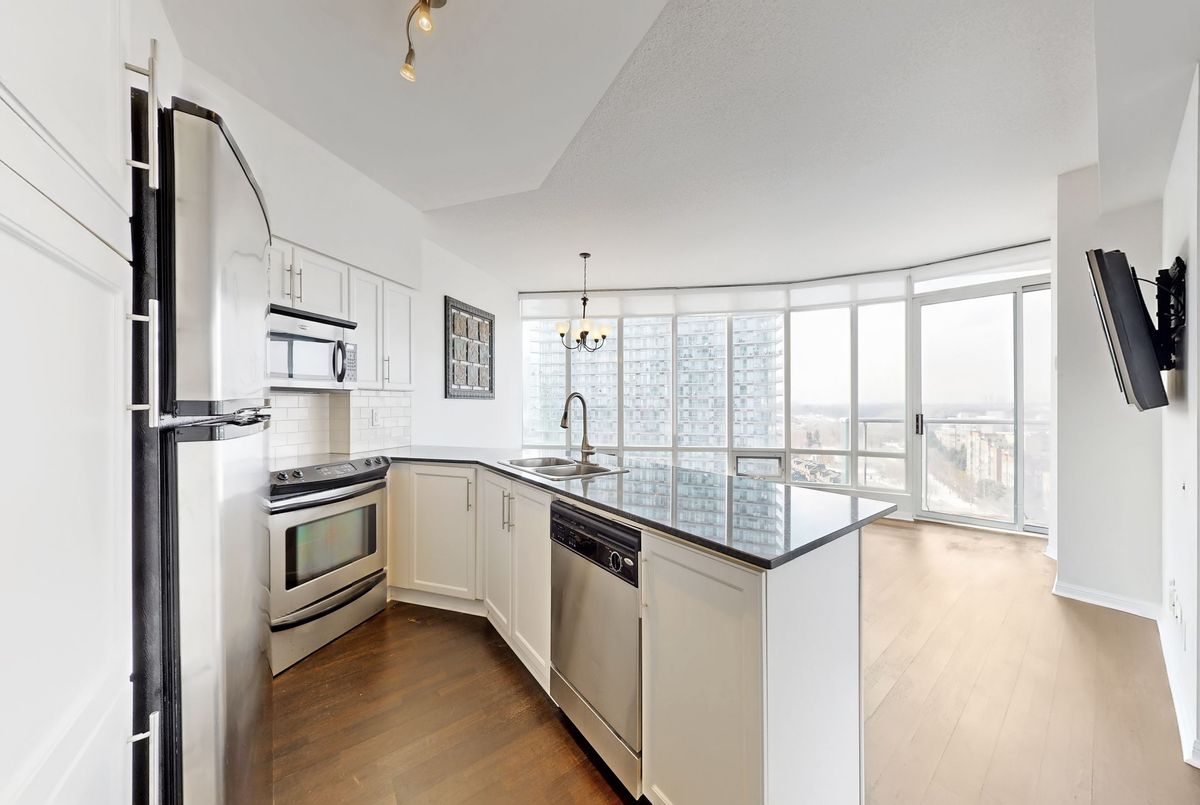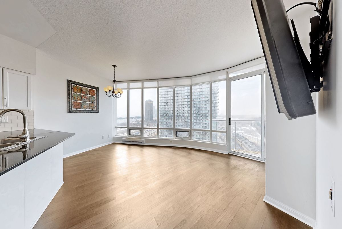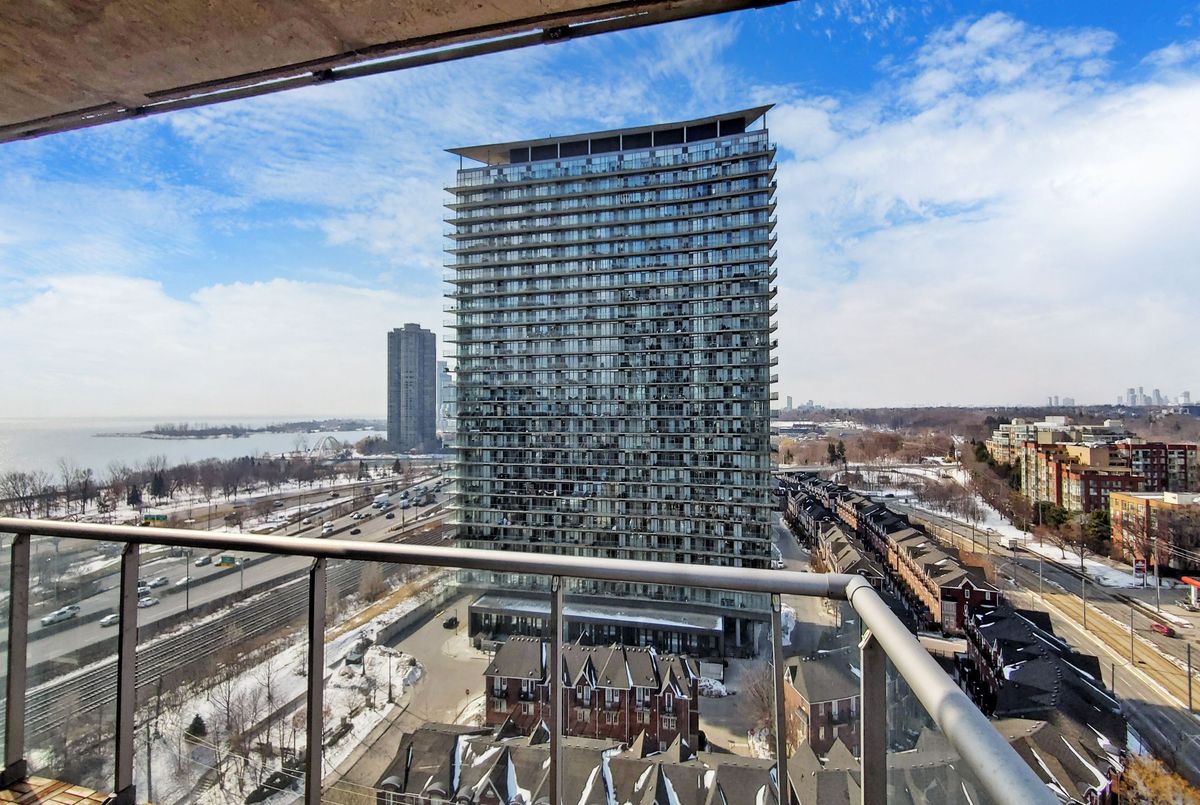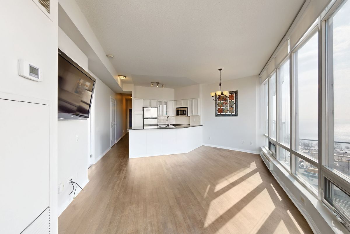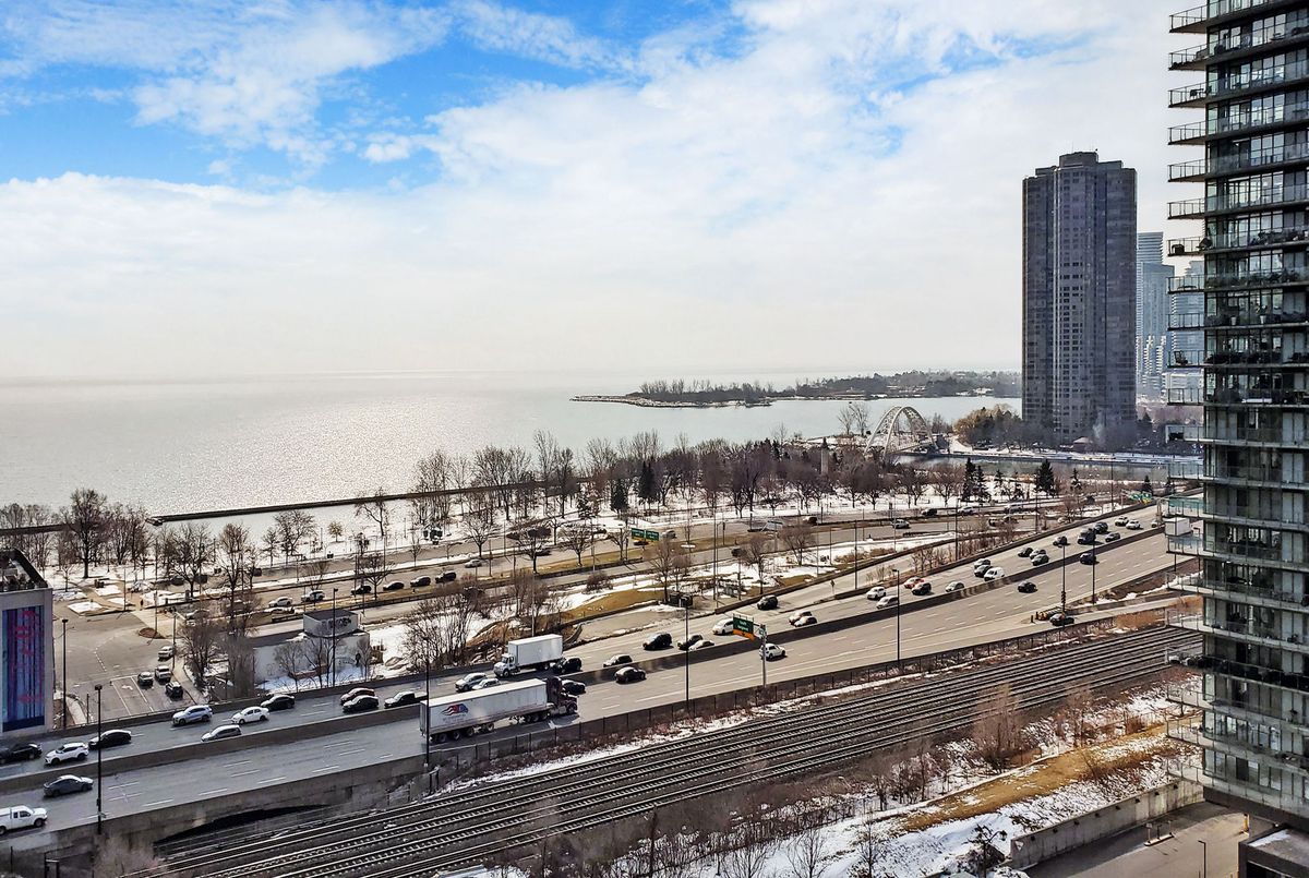 Amazing panoramic lake views set the tone for this spectacular 1+1 bedroom, 2-bath condo with parking. With over 800 sq. ft. of thoughtfully designed space, this home blends comfort with contemporary style. Lush hardwood floors lead into a sleek, open-concept kitchen featuring granite countertops and a breakfast bar - the perfect setting for effortless entertaining or relaxed evenings at home. The spacious primary bedroom offers a walk-in closet and private ensuite, while the generous den provides flexibility for a home office or creative studio. Residents enjoy top-notch amenities, including a 24-hr concierge, indoor pool, gym, Bbq, indoor golf, billiards, sauna, party/meeting room & much more! Ideally located just moments from the waterfront along Lake Ontario, scenic parks, and bike trails, with quick access to TTC, downtown and the Gardiner Expressway - placing the best of the city right at your doorstep.