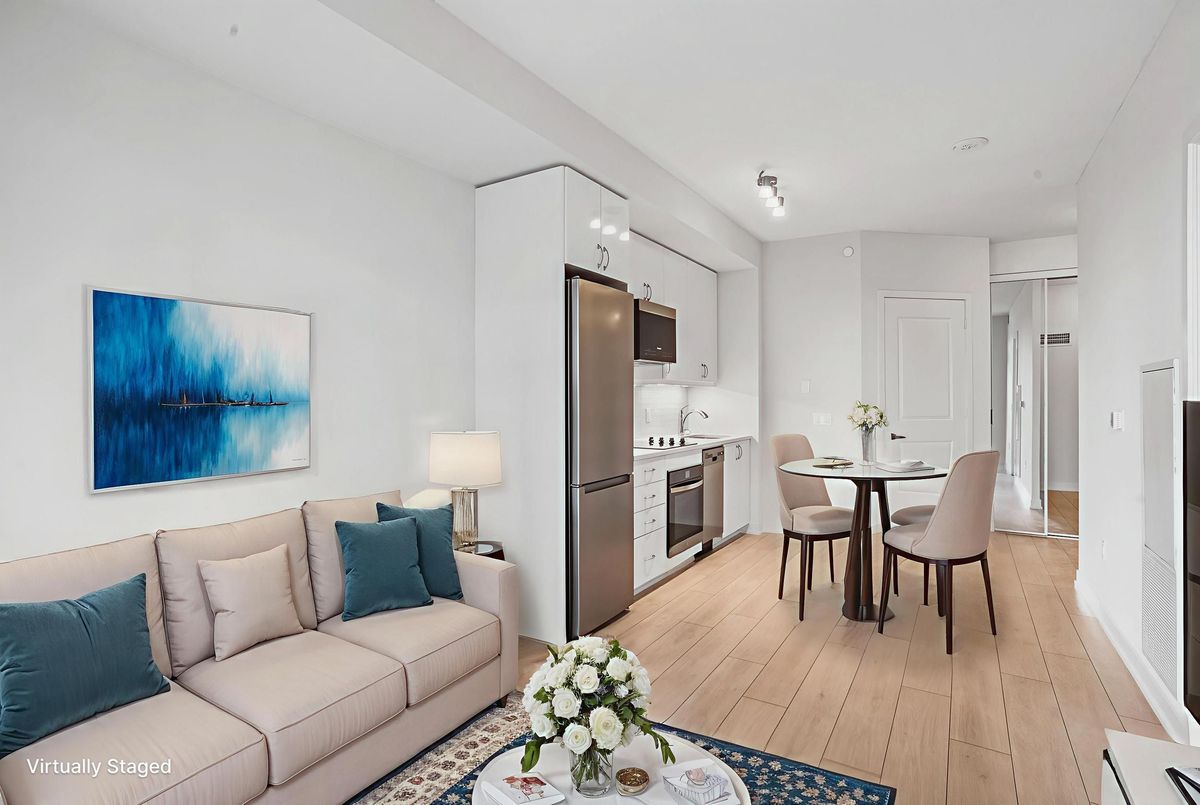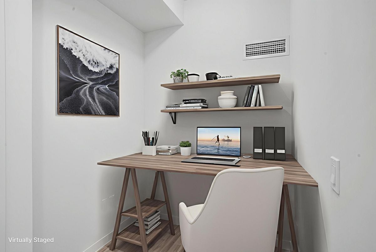 Bright 1+1 Laguna model in a luxurious building and fantastic location. Close to waterfront trail, TTC (streetcar), Restaurants, QEW... The unit offers 9 ft ceiling, laminate flooring (no carpet), stainless steel appliances (2025), stacked washer and dryer (2025), bedroom with walk-in closet, den, balcony with lake views, parking and locker. Facilities will include: Concierge, indoor pool, indoor whirlpool, sauna, exercise room, party room with kitchen bar and lounge, outdoor terrace, Billiards room, guest suites,...(unit is virtually staged)